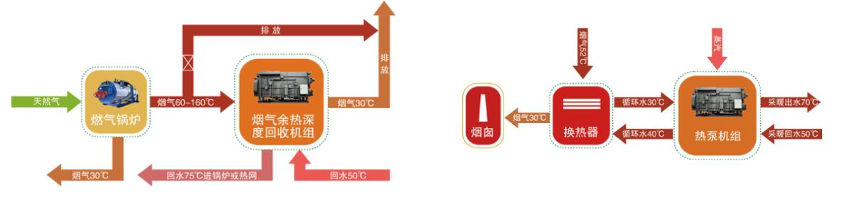 天然氣經(jīng)燃?xì)忮仩t燃燒后,產(chǎn)生的煙氣,進(jìn)入煙氣余熱深度回收機(jī)組,深度回收煙氣中的熱量使排煙溫度大幅度降低,回收的熱量用于加熱熱網(wǎng)回水或直接供熱。